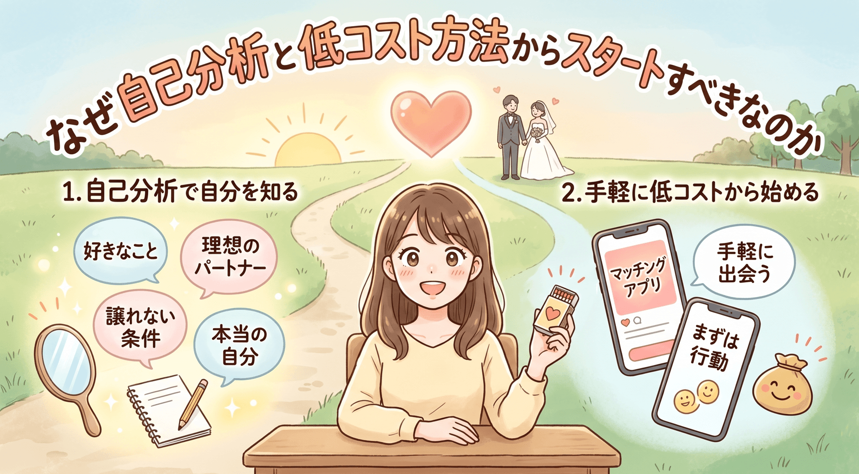 それは「自己分析をしっかり行うこと」と「マッチングアプリなど低コストな方法から始めること」の2つです。