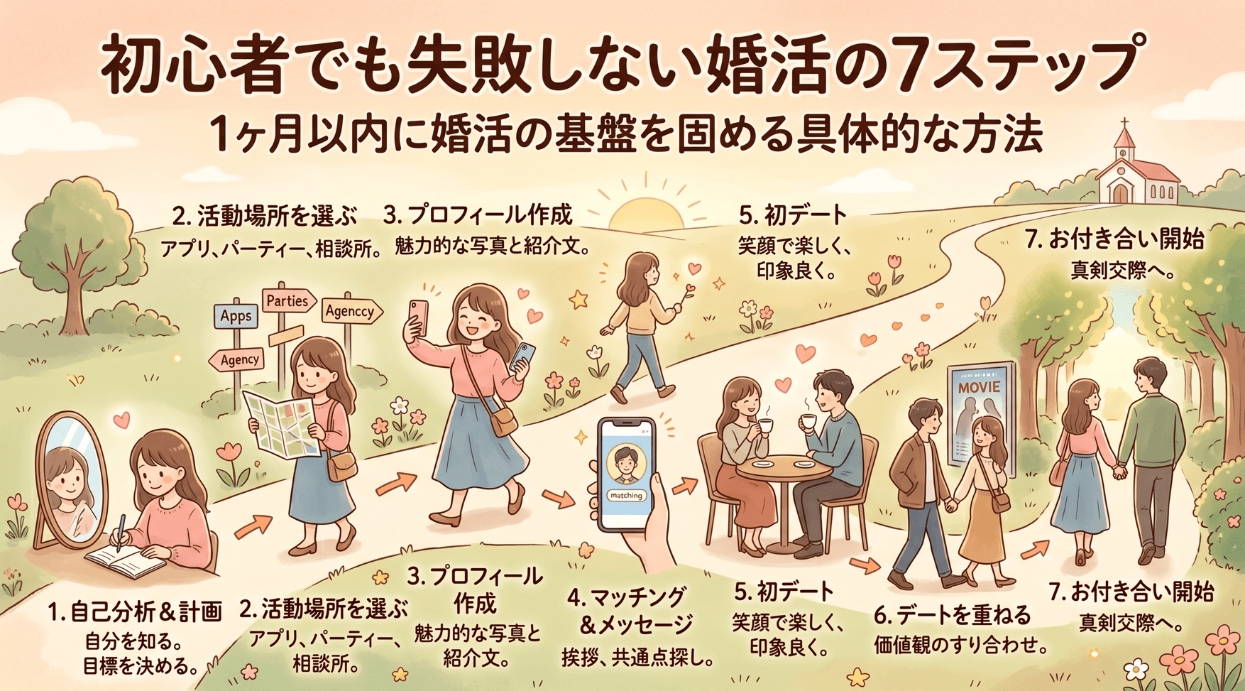 ここからは、婚活初心者の方が迷わず進められるよう、具体的な7つのステップをご紹介していきますね。