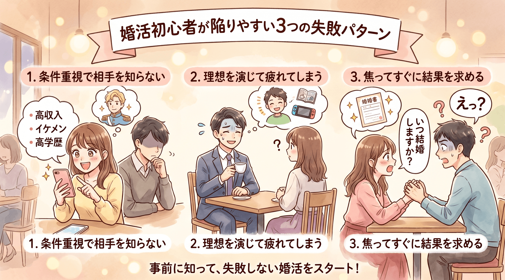 ここで、婚活初心者の方がやってしまいがちな失敗パターンについてもお伝えしておきますね。