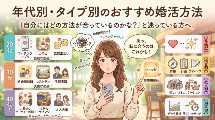 婚活と一口に言っても、マッチングアプリや結婚相談所、婚活パーティーなど選択肢がたくさんあって、どれを選べばいいのか迷ってしまいますよね。